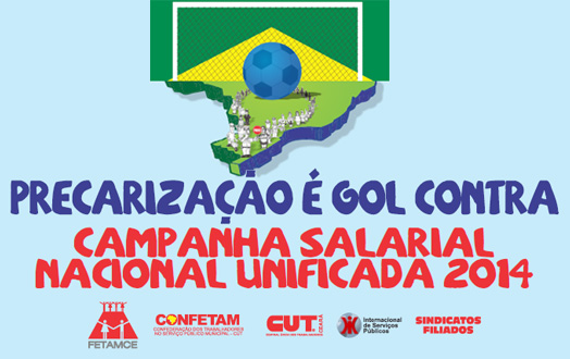 Nesta terça-feira (10), será lançada a Campanha Salarial Estadual no Serviço Público 2014, na Assembleia Legislativa do Estado. A audiência terá início a partir das 14h30min, e é uma requisição da deputada estadual Raquel Marques, a pedido da Federação dos Trabalhadores no Serviço Público Municipal do Estado do Ceará (Fetamce). A campanha traz o tema “Precarização é gol contra”, um diálogo com o ano da Copa do Mundo. Mais de 184 municípios estarão representados na audiência. Haverá um momento em que será instalada uma trave para que os deputados marquem o seu gol a favor do trabalhador.
